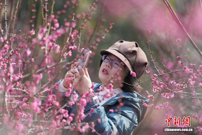 1月23日,长沙气温回升,湖南省植物园梅花绽放,市民来到梅林邂逅冬日里难得的阳光与温暖。图为游客拍摄梅花。中新社记者 杨华峰 摄