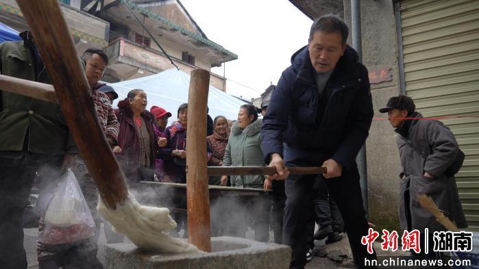 直播间外的民俗体验区同样人气爆棚。石臼中蒸腾的糯米被木锤反复捶打,“咚咚咚”的声响中,米团渐渐变得细腻软糯,围观民众纷纷上手揉制,欢笑声不断。另一侧,书法爱好者挥毫泼墨,一副副春联被陆续送到民众手中,墨香与米香交织出浓厚年味儿。
