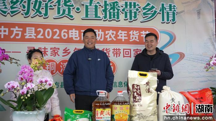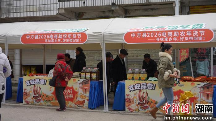 中新网湖南新闻1月28日电 (杨森)湖南怀化市中方县2026年“中味方好”年货节铜湾镇专场活动27日在铜湾集镇启幕,通过“线下展销+线上直播”的融合模式,将优质晚稻大米、菜籽油、腊肉等农产品与打糍粑、写春联等民俗活动打包呈现,让城乡消费者在烟火气中品味地道“中方味道”。