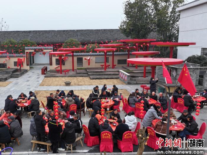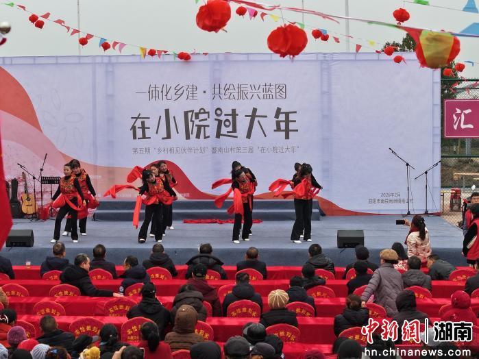 中新网湖南新闻2月8日电 (刘馨予 卢创奇)2月7日,湖南益阳市南县南洲镇南山村村部锣鼓声、欢笑声交织成小年序曲,第三届“在小院过大年”活动温情启幕,地道民俗体验、村民自编自演的节目、暖心团圆宴轮番登场,湖区乡村的年味在烟火气与欢笑声中拉满。