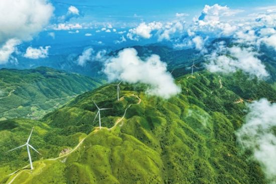 6月16日,通道侗族自治县湘寿坪风电场,一排排风力发电机组矗立在群山上,云雾缭绕,秀美壮观。近年,该县立足新能源产业发展优势,抢抓碳达峰、碳中和重大战略机遇,大力推进风电新能源项目建设,为经济可持续发展注入新活力。 石猛雷 摄(湖南图片库)