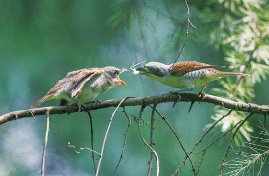 7月3日,长沙市开福区太阳山森林公园,虎纹伯劳喂养小鸟。伯劳个头不算大,但它是雀形目里最凶悍的,面对捕猎对象,凶猛劲头甚至不输小型猛禽。因虎纹伯劳喜爱将猎物挂起来,素有“屠夫鸟”之称。但在呵护幼鸟成长时,鸟妈妈也有温柔、细腻的一面。湖南日报全媒体记者 张京明 摄