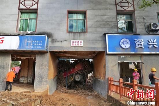 一辆汽车被山洪冲入湖南资兴市州门司镇一建筑物。