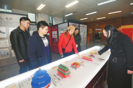 1月23日,长沙图书馆视障文献阅览室,盲人志愿者(左三)在给读者介绍“触摸中轴·指尖云游”北京中轴线展览。该展览是中国盲文图书馆推出的首个全程为视障人士提供一系列非视觉观展体验的展览。