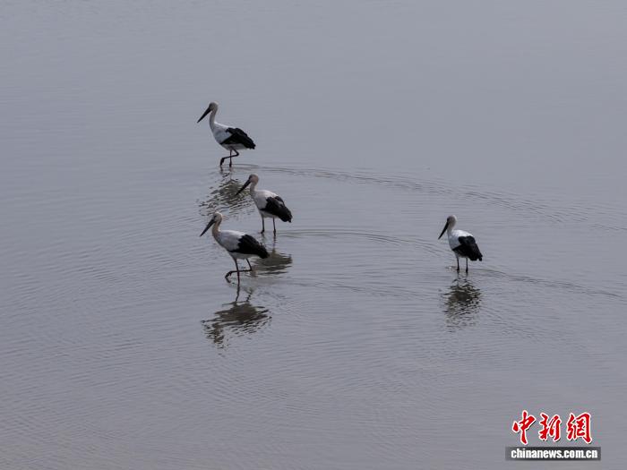 2月11日,湖南南洞庭湖湿地上风港水域的候鸟东方白鹳。 钟祖彪 摄