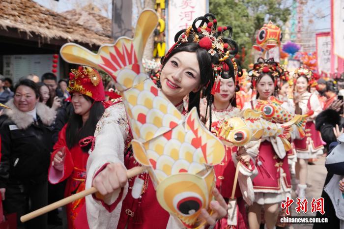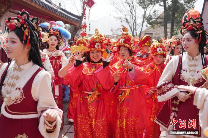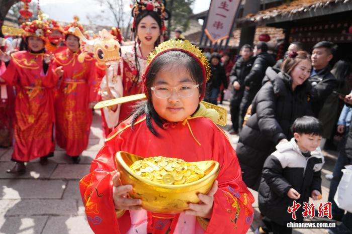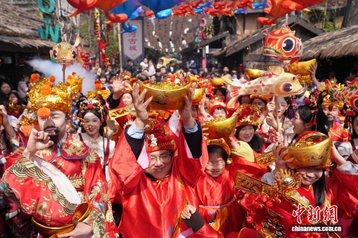 2月21日,大年初五,湖南长沙宁乡炭河古城招募100名周边村民与游客化身NPC“财神”,参与巡游表演,为现场游客送福送喜,让大家在沉浸式互动中体验新春乐趣。