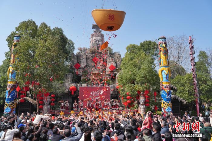图为村民、游客高抛金元宝寓意迎财。中新社记者 杨华峰 摄