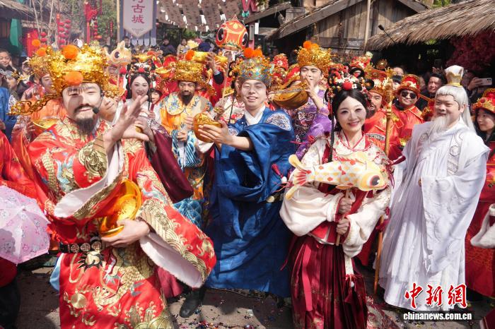 图为村民、游客扮“财神”在古城巡游表演。中新社记者 杨华峰 摄