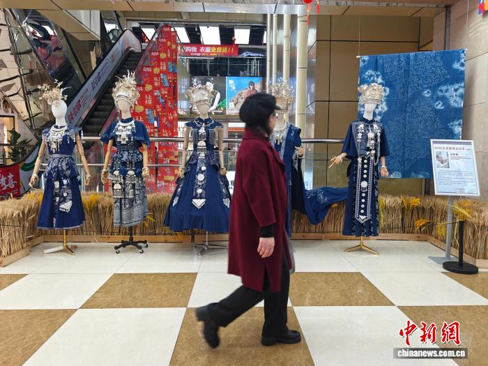 2月13日,株洲市芦淞区的服装市场举行“2026炎帝服饰文化节”。图为一名顾客经过在此展出的非遗技艺作品与民族服饰。 程小路 摄