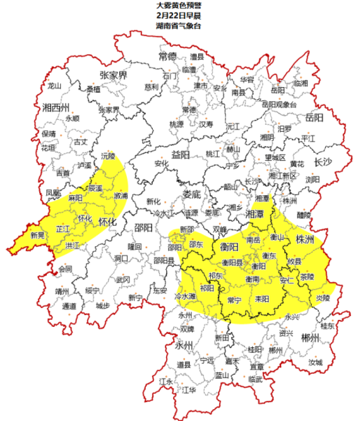 黄色预警区域:株洲、湘潭东部、怀化中北部、邵阳东部、衡阳、永州北部、郴州北部。