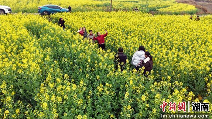 中新网湖南新闻2月27日电 (唐小晴 邓卓 唐游光 陈学华)早春二月,东安县鹿马桥镇唐家村千亩油菜花竞相绽放,金色花海与青山民居相映成趣,吸引周边县市游客打卡踏青。
